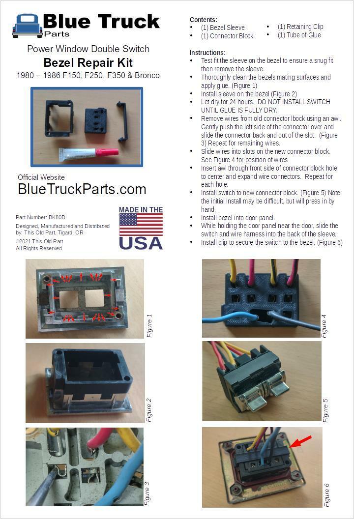 - Kit provides a form fitting sleeve that glues to the the back of the bezel which provides a surface for the included clip to attach. Existing wires and connectors are installed into the replacement connector block. The clip holds the switch and wire harness securely in place.